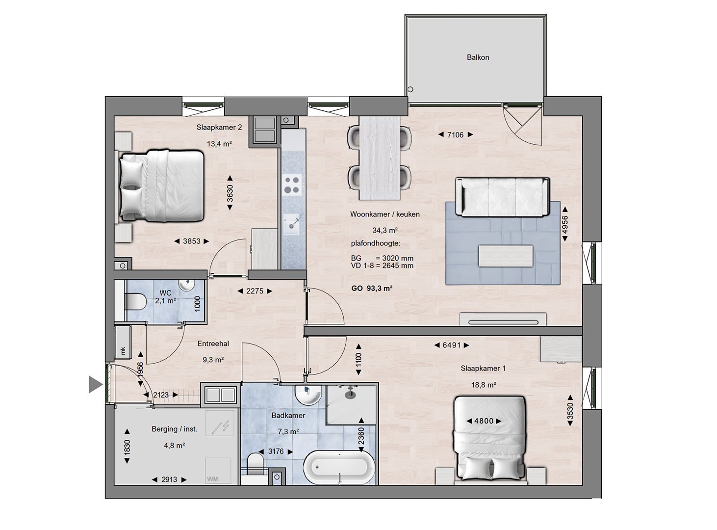Via de voordeur stap je direct in de ruime entreehal met plek voor de garderobe. Via deze entreehal zijn alle ruimte bereikbaar, namelijk de berging en installatieruimte, meterkast, badkamer, toilet, woonkamer en twee slaapkamers. De woonkamer en open keuken grenst aan het ruime balkon waar je heerlijk kunt genieten.